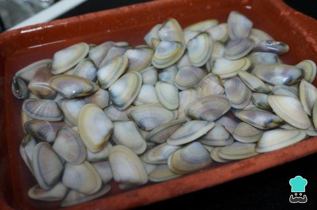 Para preparar las coquinas o tellinas a la plancha, primero limpia las coquinas. Coloca un bol con agua y sal, añade las coquinas y déjalas durante 1 hora, así irán soltando la tierra. Pasada la hora, cambia el agua y vuelve a lavarlas, añade agua y sal, déjalas otro rato para que terminen de soltar el resto de tierra. Desecha las coquinas que veas que están rotas.