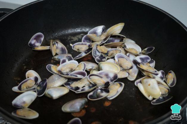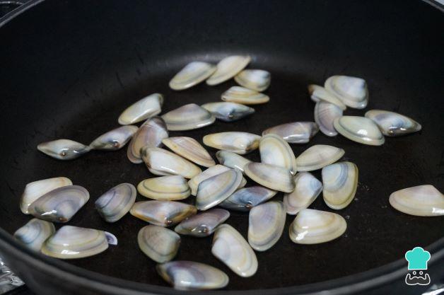 Añade un chorro de aceite de oliva y, cuando esté caliente el aceite, incorpora las coquinas.