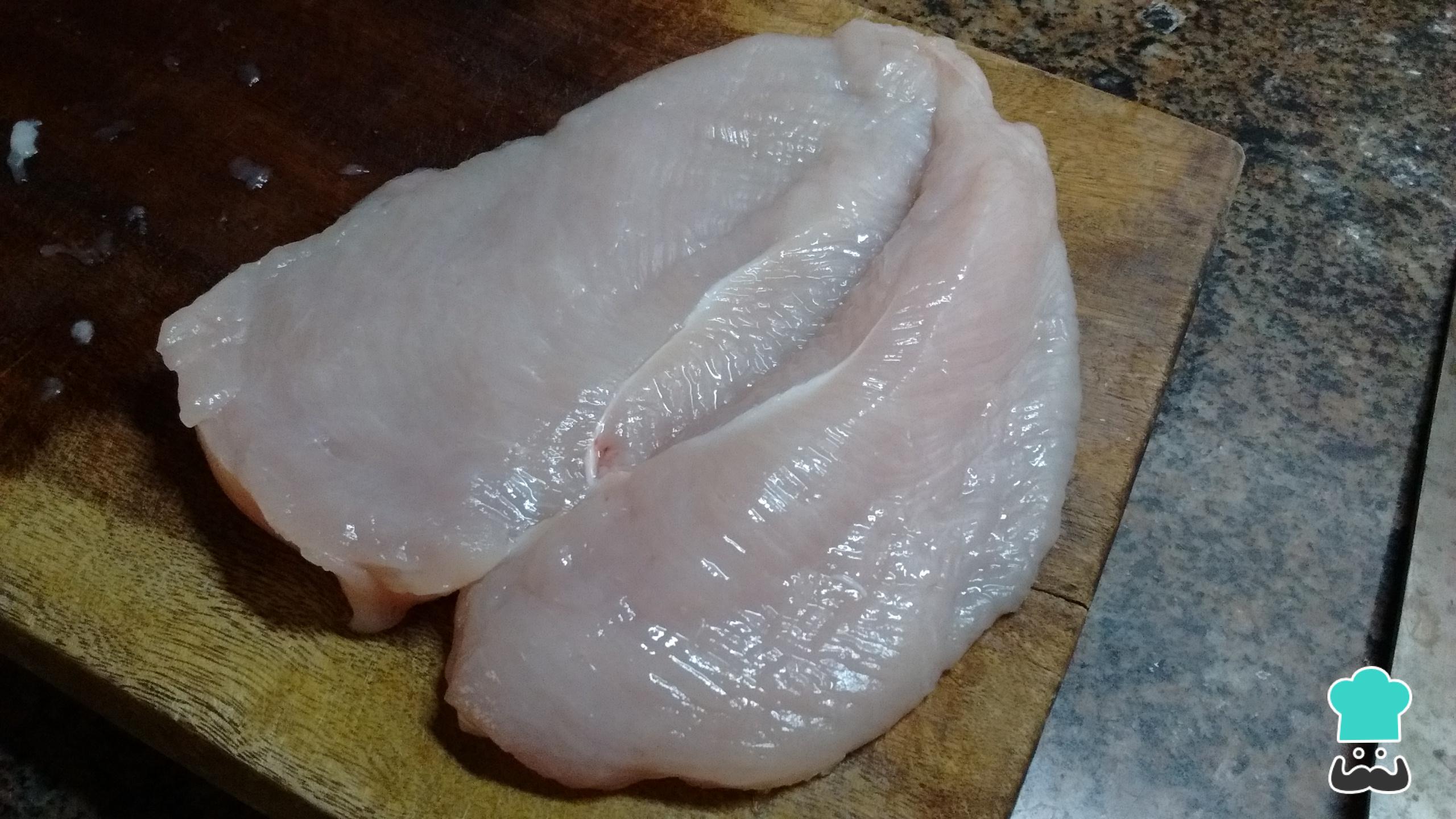 El primer paso para hacer las supremas o pechugas de pollo rellenas consiste en filetear la suprema en dos partes para lograr 2 filetes.