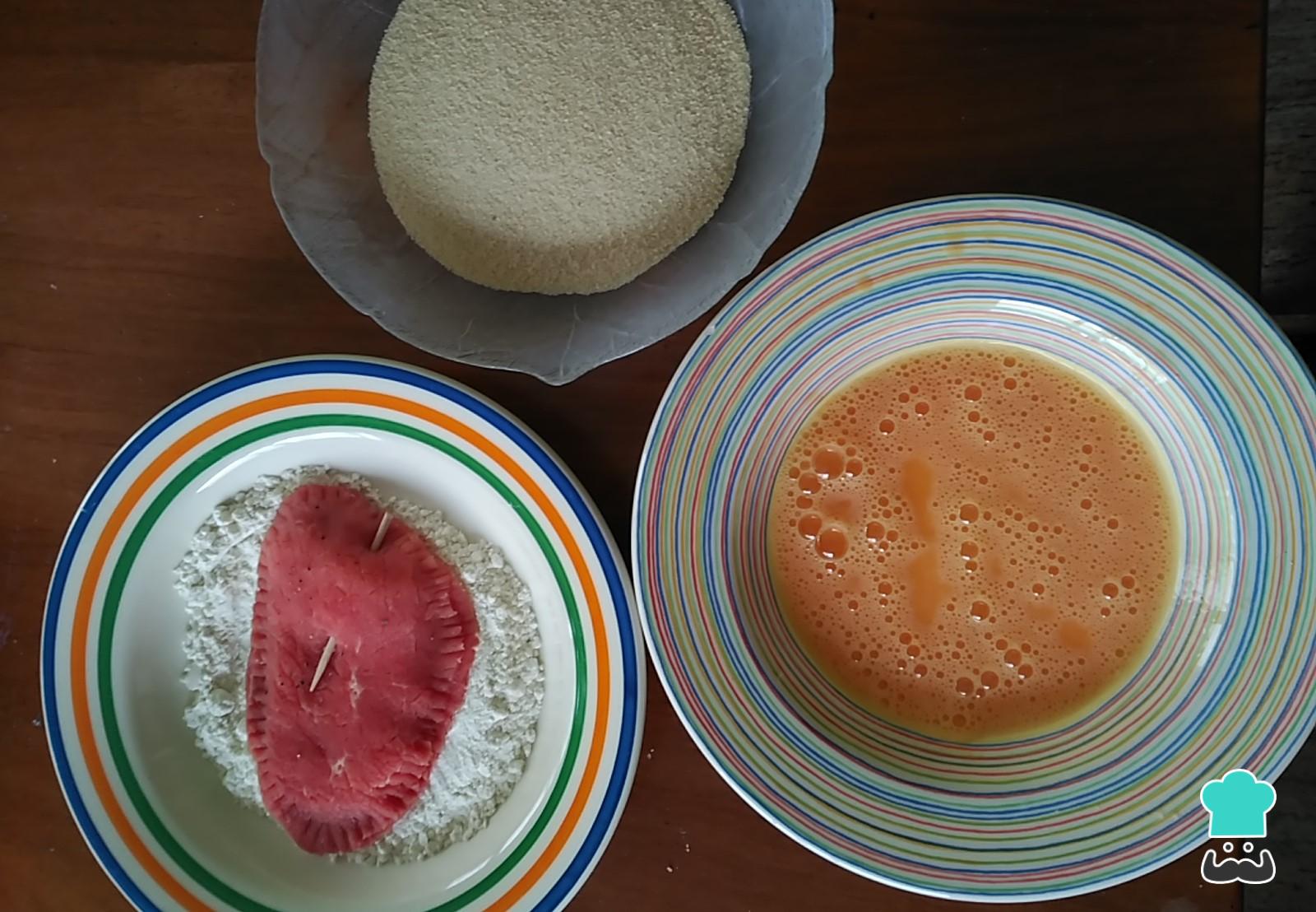 Luego, prepara la estación de rebozado colocando en platos diferentes el huevo batido, la harina y el pan rallado. Pasa cada filete relleno primero por harina, huevo y pan rallado.