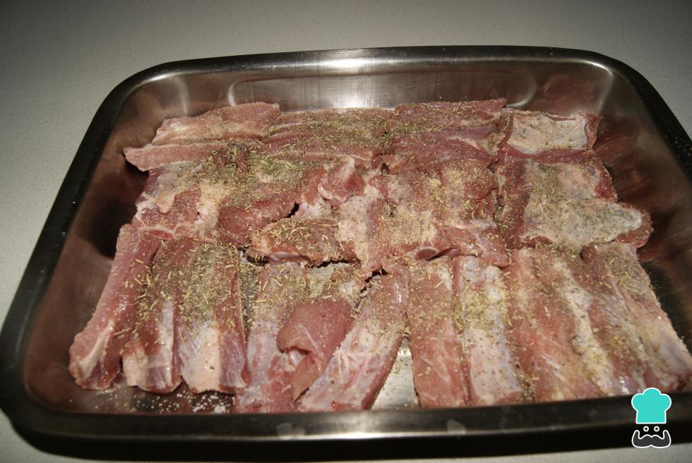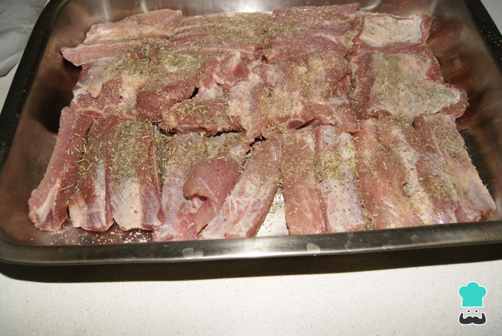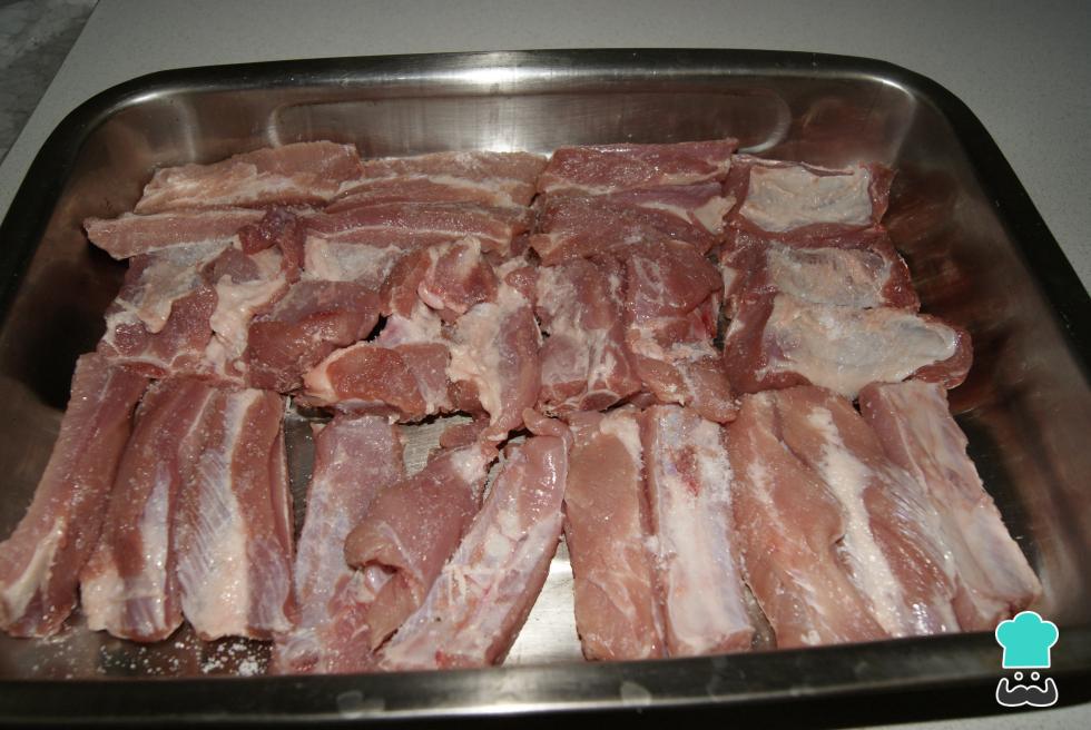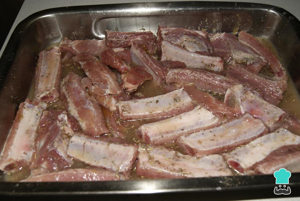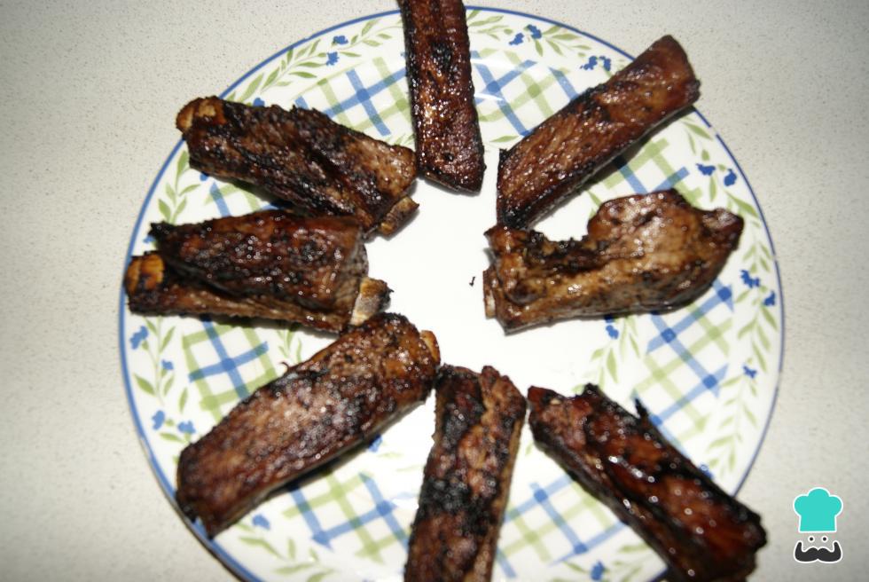 Para conseguir que tengan un toque más crujiente no las haremos al horno, sino que las haremos fritas pero luego de un proceso de marinado de 24 horas que hará que nuestras costillas queden super jugosas y con mucho sabor.