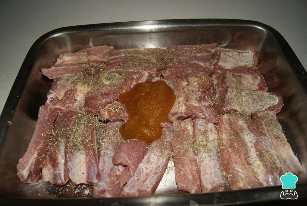 Reserva en la nevera, tapado con papel film, durante al menos 12 horas. Lo mejor es dejarlo de un día para otro, o si tienes tiempo, dejar las costillas adobadas marinado por 24 horas.