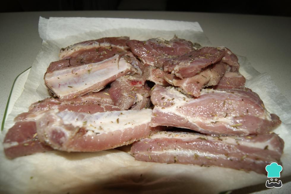 Pasado este tiempo, escurrimos bien las costillas marinadas y las colocamos sobre papel absorbente para retirar el exceso de líquido.