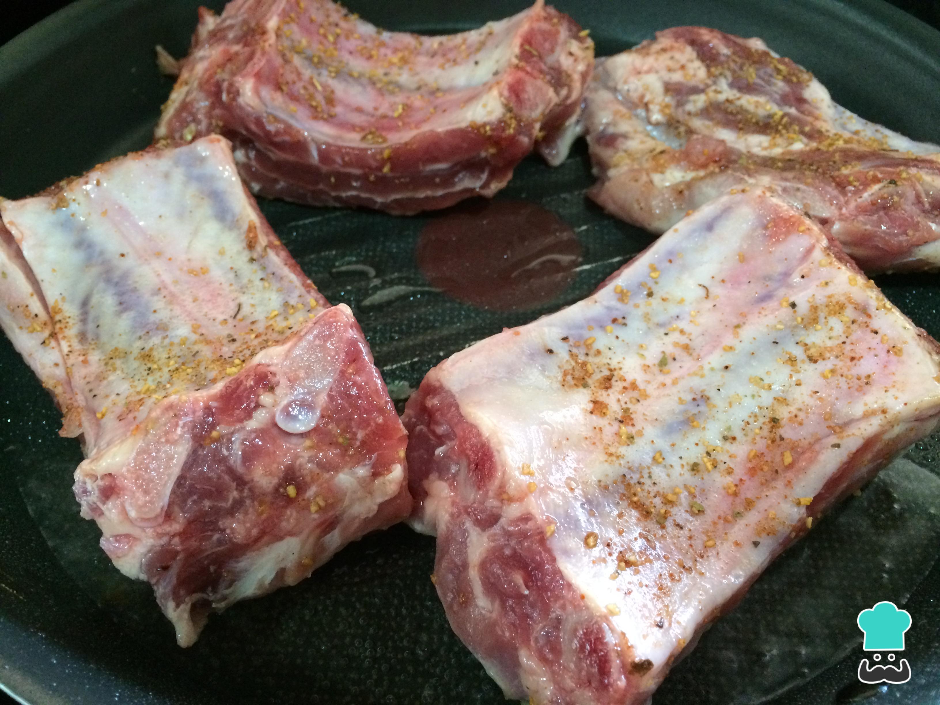Aparte, salpimenta las costillas de cerdo, adereza con el condimento cajún y sella en una sartén con un poco de aceite hasta que estén doradas.