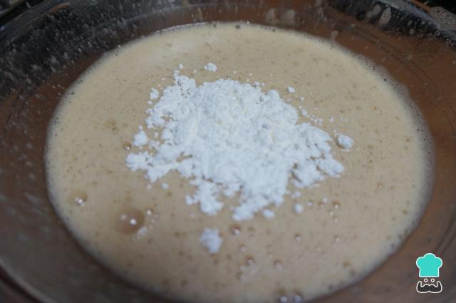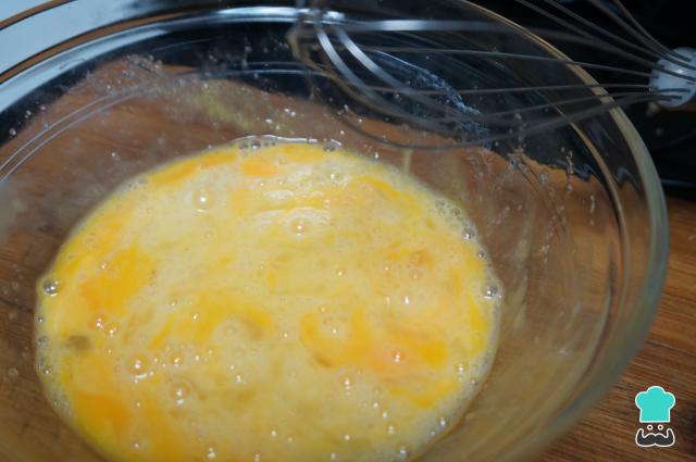 Precalienta el horno a 200 ºC con calor arriba y abajo. Mezcla los huevos con el azúcar y bate bien con unas varillas eléctricas hasta que blanqueen. También puedes usar varillas manuales si no tienes eléctricas.