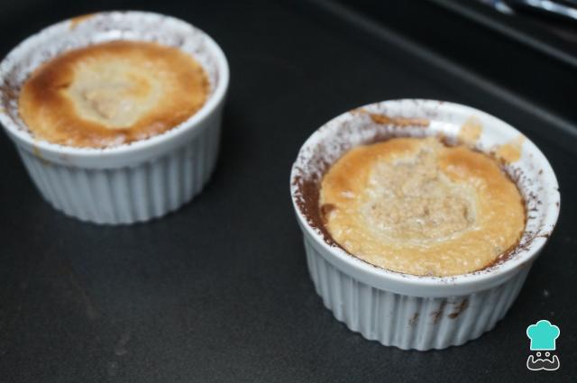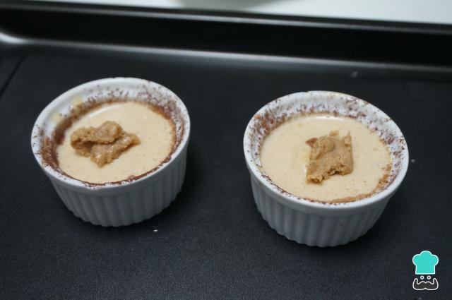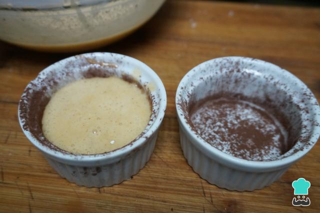 Coge unos moldes o vasos para horno, unta un poco de mantequilla y espolvorea cacao en polvo. Introduce la mezcla hasta rellenar 3/4 partes del molde. Tapa con papel film y mételos en la nevera una hora para que la masa esté bien fría.