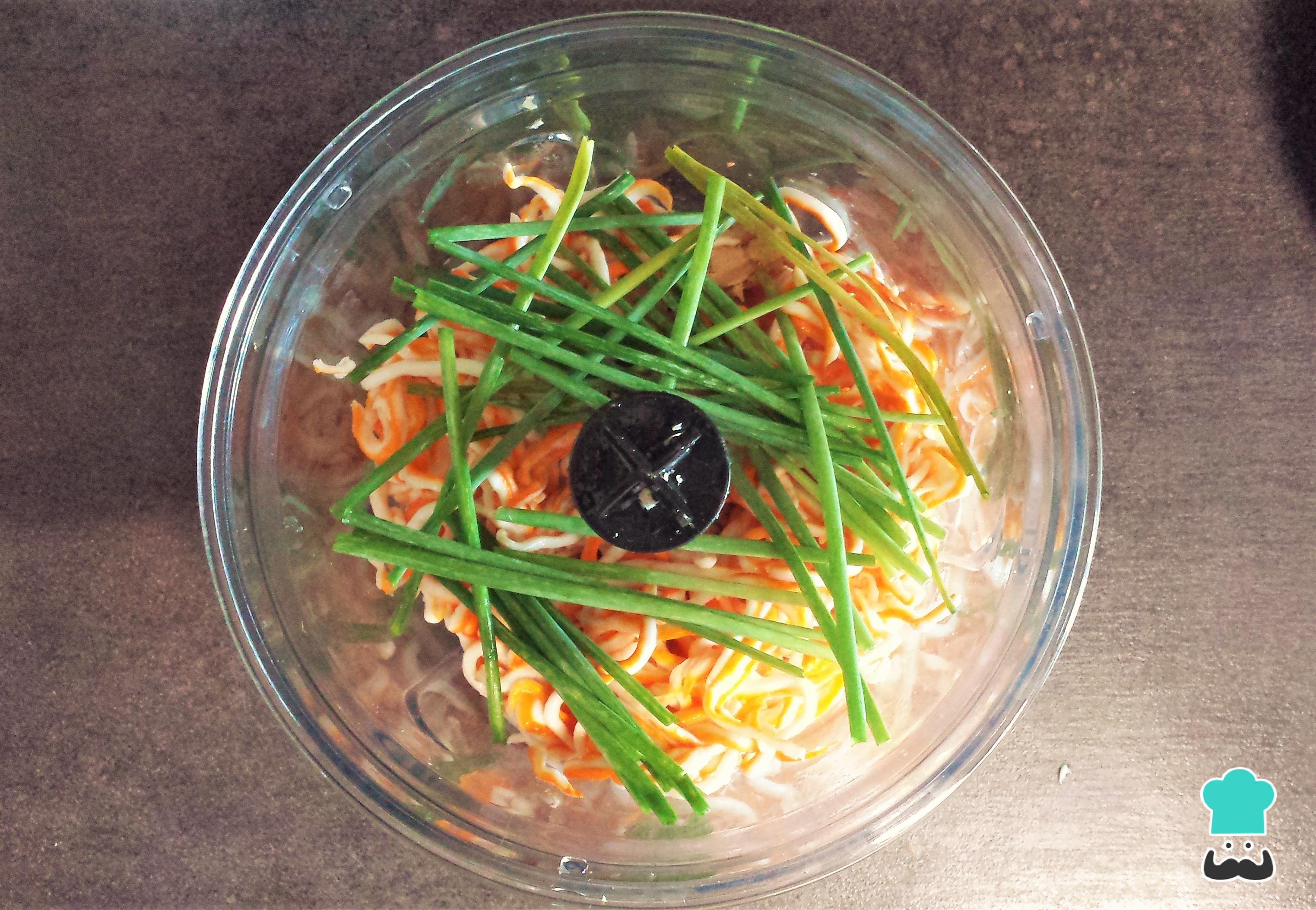 Coloca los palitos de cangrejo o surimi también el vaso. Puedes usar cualquier sucedáneo de cangrejo, incluso los que vienen congelados.