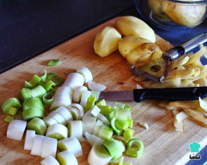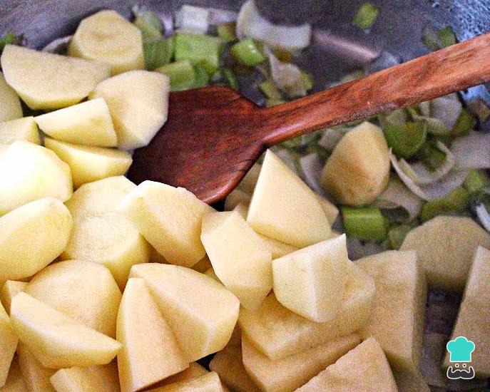 Lavamos el puerro y lo cortamos en trozos no muy grandes, como se observa en la fotografía. Luego, en una cazuela con un fondo de aceite caliente, lo sofreímos durante 3 o 4 minutos. Pelamos también las patatas, las cortamos y las añadimos al sofrito pasado este tiempo.