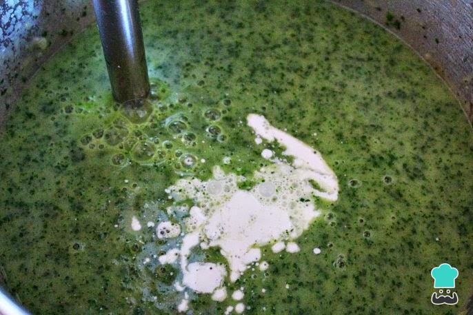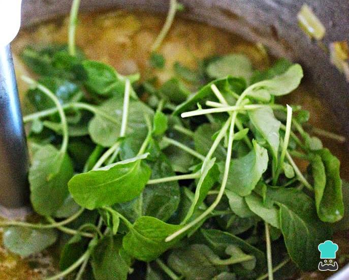 Cuando esté listo, retiramos la cazuela del fuego y agregamos los berros previamente lavados y escurridos. Lo mezclamos todo y lo batimos con una batidora hasta obtener una crema suave y homogénea. También puedes usar una licuadora.