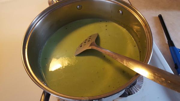 Deja que la preparación espese y retírala del fuego cuando esté lista. Si quieres, puedes triturar la crema de brócoli con una batidora eléctrica de mano para asegurarte de que no quede ningún grumo.