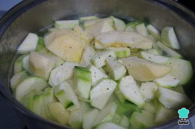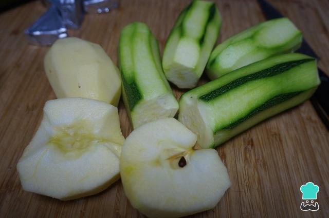 Pon una cazuela con agua y un poco de sal y pimienta. Corta los calabacines en trozos, la patata y las manzanas. Deja cocinar hasta que quede todo tierno.