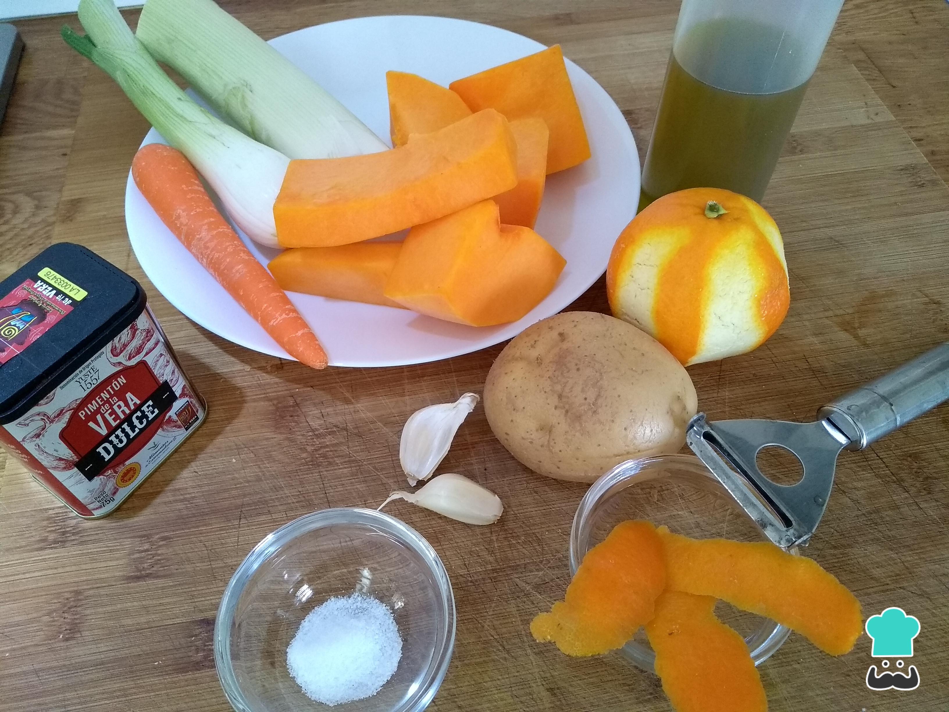 Limpia y corta la calabaza, haz lo mismo con la zanahoria y quita las puntas de los extremos. Pela la patata y los ajos. Corta tres tiras de piel de una naranja para darle un toque único a tu crema de calabaza fácil.