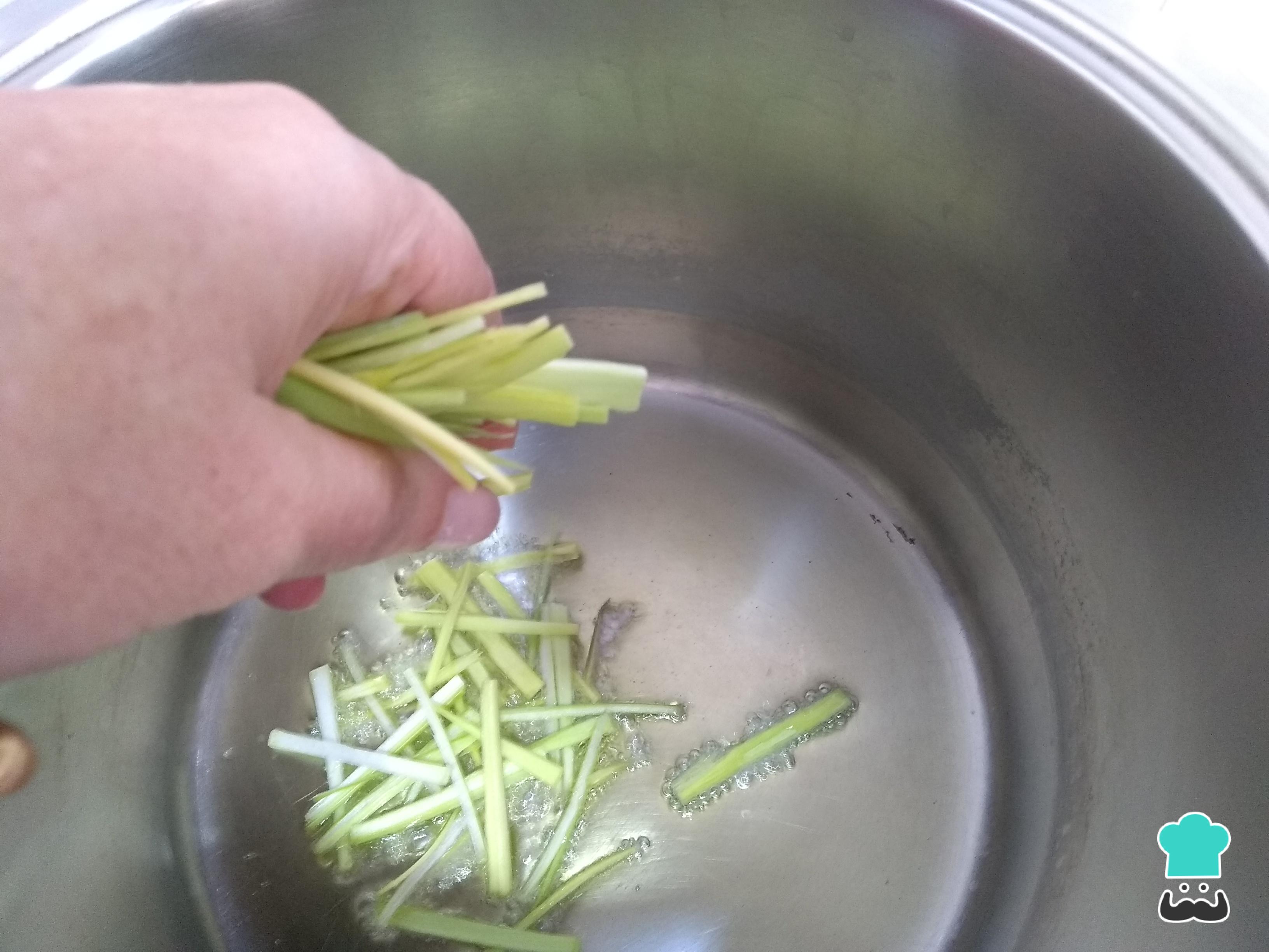 Corta el puerro a la mitad, límpialo y retira la primera capa. Abre una de las mitades del puerro por el centro y córtalo en tiras muy finas. Rehoga el puerro en un chorro de aceite de oliva ya caliente, remueve las tiras por un minuto sin dejar que se doren demasiado. Reserva.