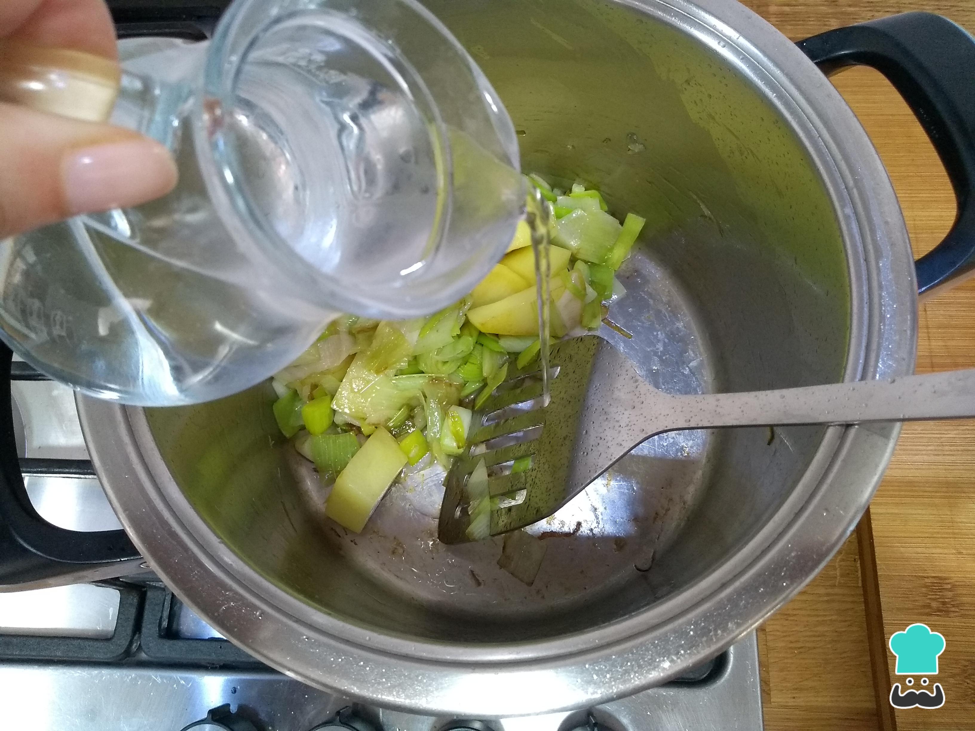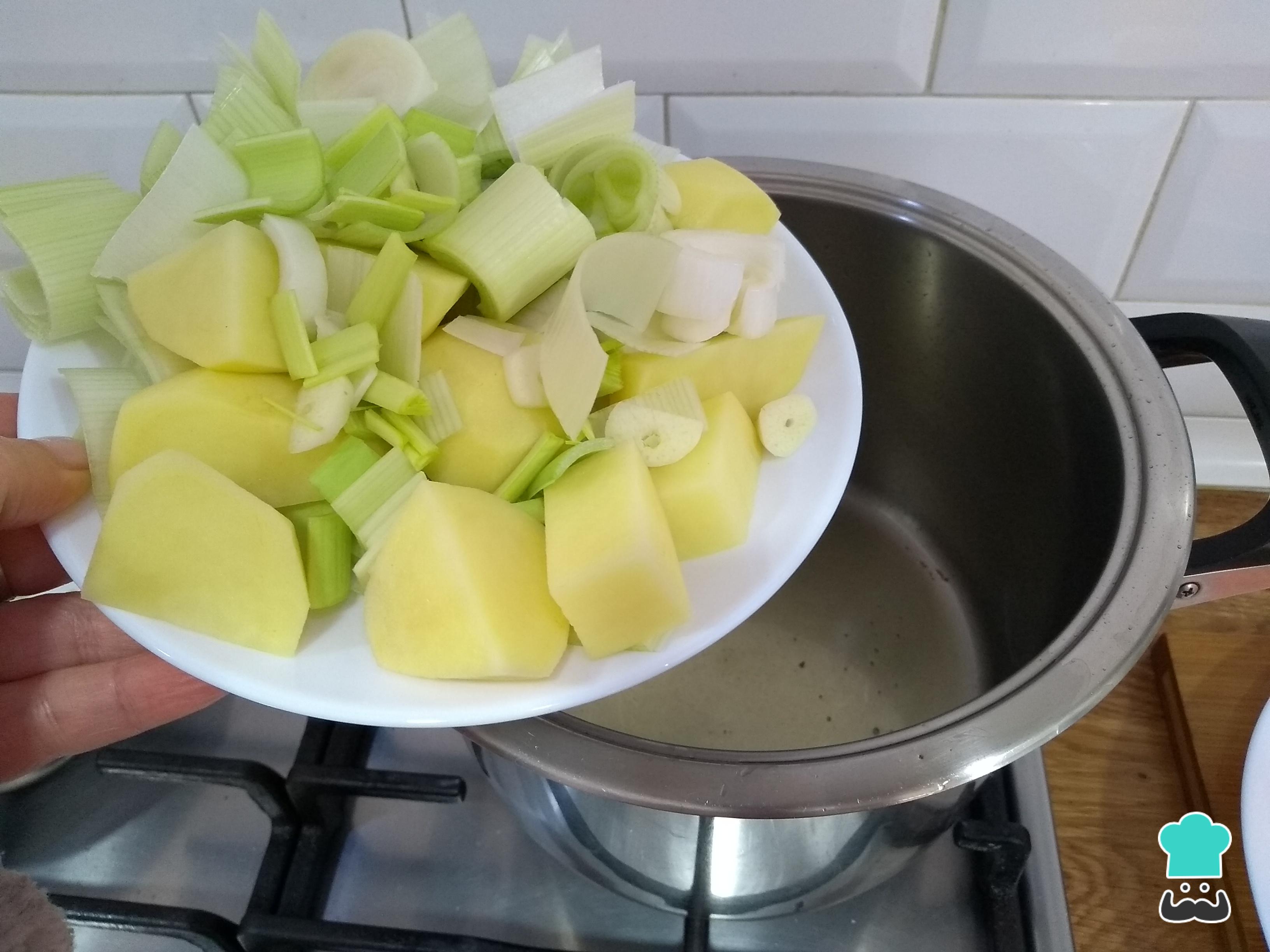 Corta la patata y la cebolleta en trozos pequeños, así como el ajo y el resto del puerro. Rehoga y remueve durante 3 minutos para que los sabores se unifiquen.