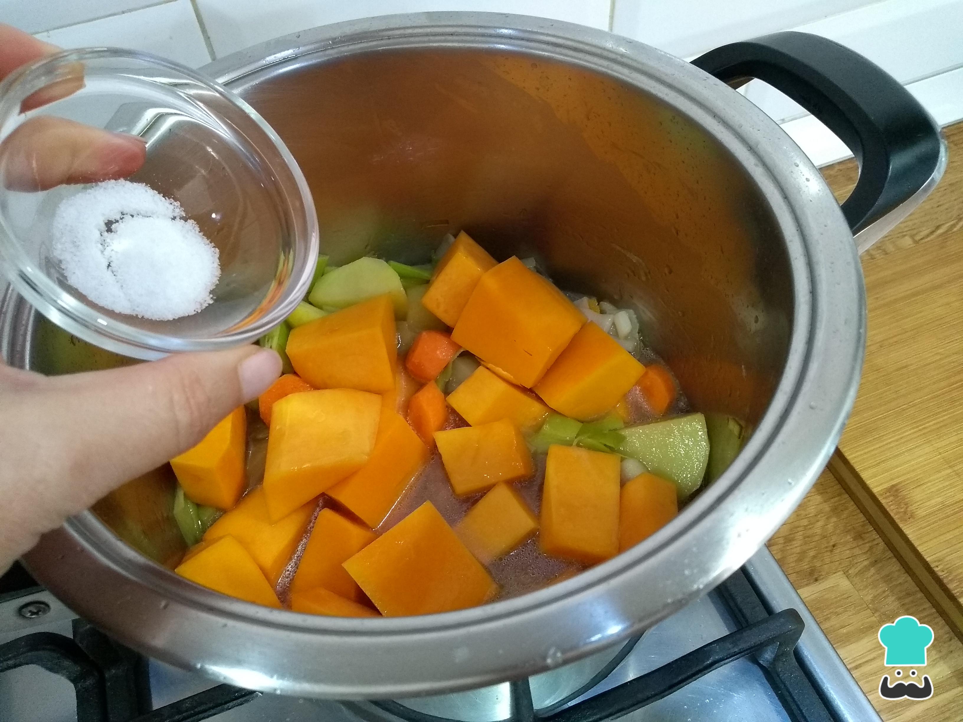 Corta la calabaza en trozos pequeños para que se cocine más rápido. Añádela a la cocción junto a la piel de naranja y un punto de sal. Tapa la olla y deja cocer por 15 minutos a fuego suave.