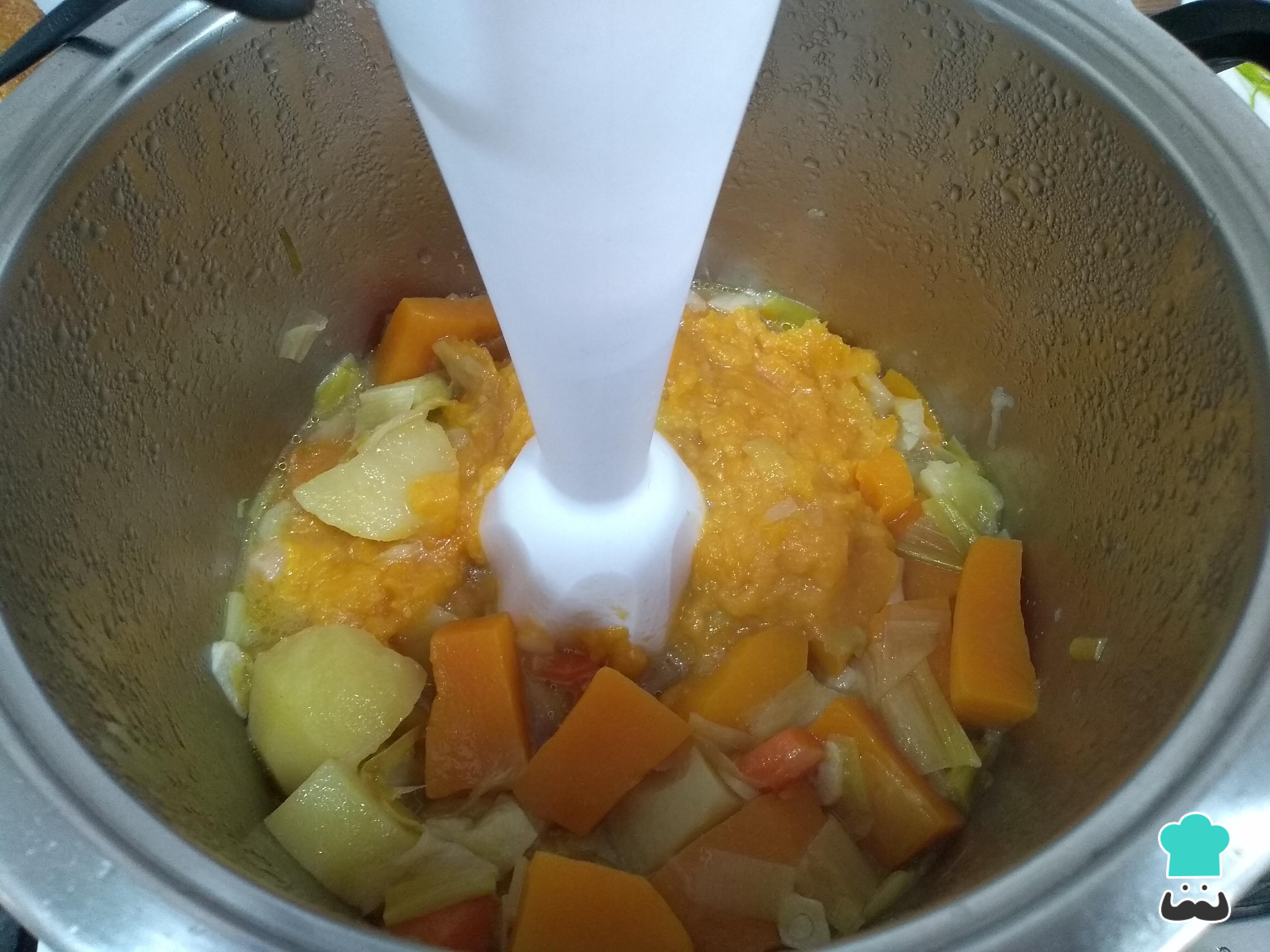 Una vez esté todo cocido, tritura hasta dejar la crema de calabaza con una textura fina y homogénea. Si te gusta más espesa, puedes quitar líquido antes de triturar. Si te gusta más líquida, solo añade un poquito más de agua.