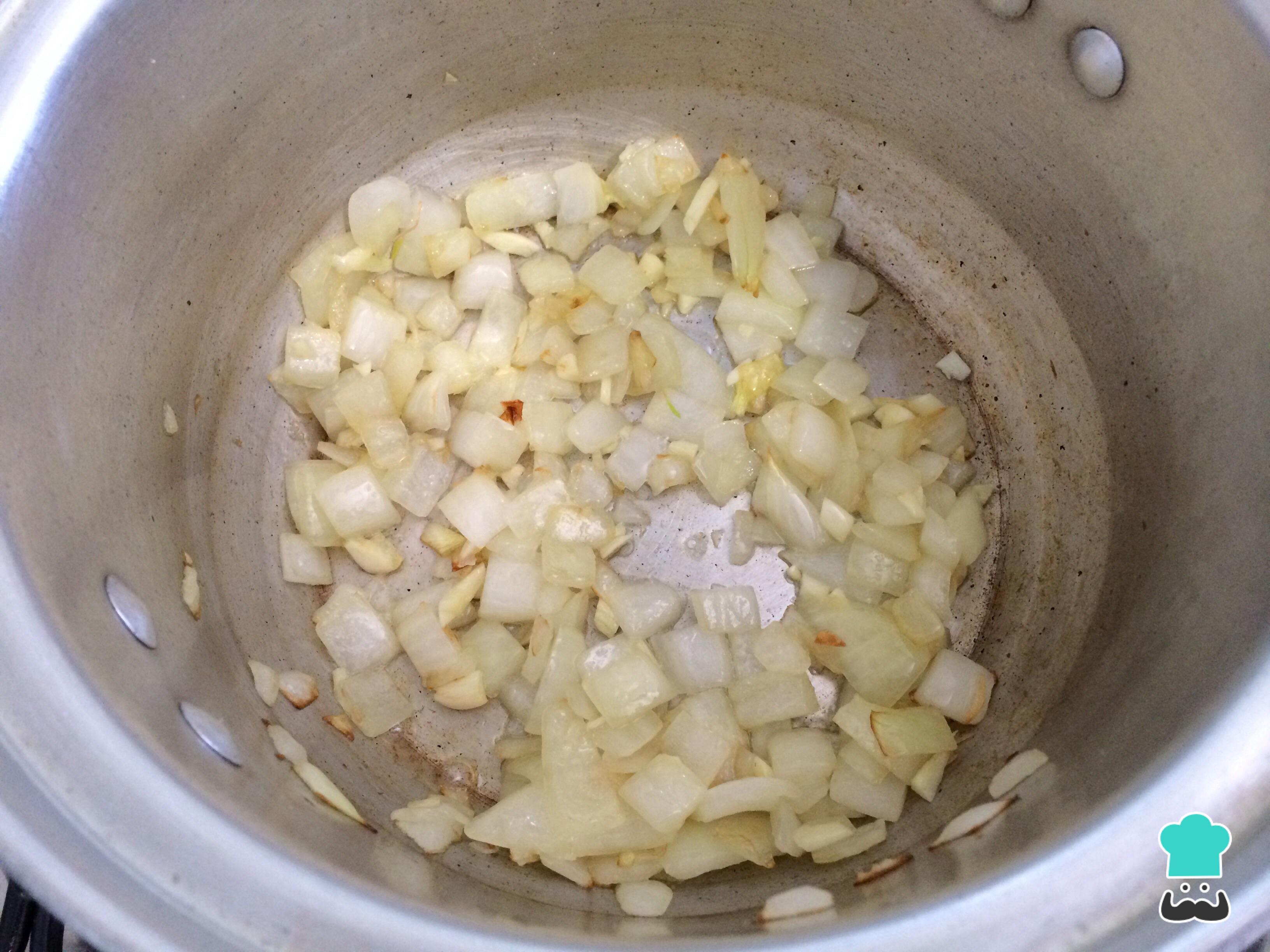 En una olla, con aceite de oliva a fuego bajo, cocinar la cebolla y el ajo previamente cortados en cuadritos medianos hasta que esté blando.