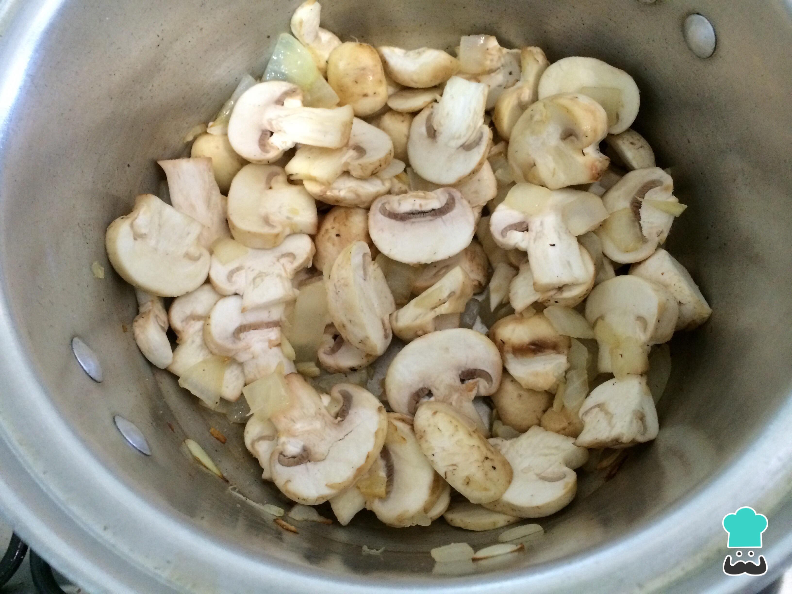 Añadir los champiñones cortados en rodajas, salpimentar y cocinar hasta que estén dorados.