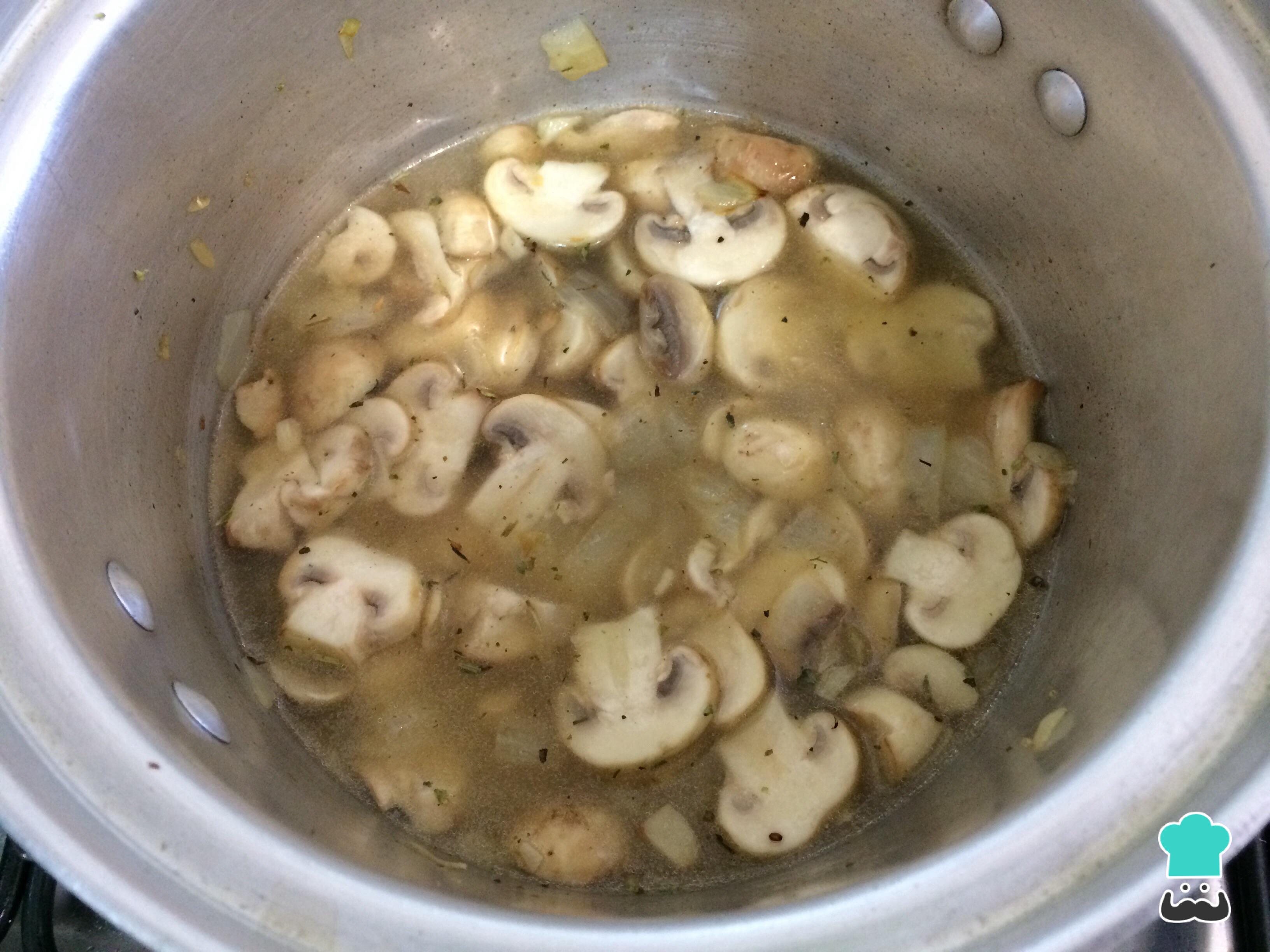 Para que la crema quede en su punto, el truco esta en añadir el caldo 1/2 centímetro arriba de los champiñones. También agrega una pizca de orégano y tapa para dejar cocinar a fuego lento durante 15 minutos.