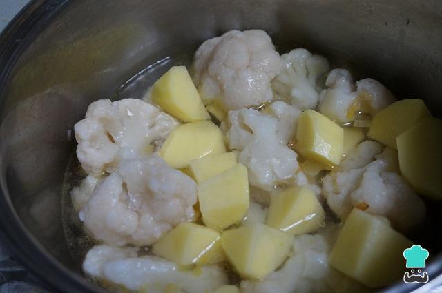 Añadimos junto a la cebolla, los ramilletes de coliflor y las patatas peladas y cortadas en trozos. Cubrimos con agua, añadimos un poco de sal y dejamos cocer hasta que quede todo bien blandito.