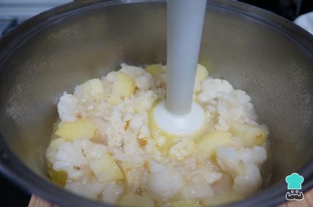 Pasamos todo la crema de coliflor y patata por la batidora hasta que quede una crema muy fina.