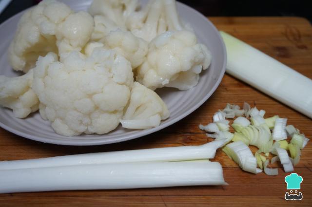 Separa la coliflor en ramilletes y lávalos bien. Por otro lado, limpia el puerro y córtalo en trozos pequeños.