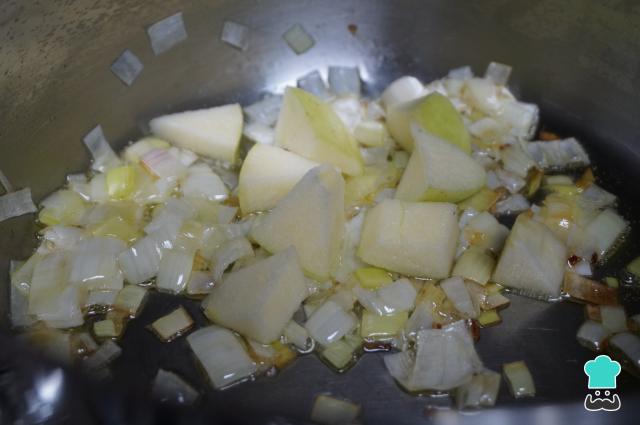 Calienta una cazuela con un chorro de aceite de oliva, añade el puerro y cocínalo unos minutos a fuego medio. Antes de que empiece a dorarse, agrega la manzana y deja que se cocine todo unos minutos más.