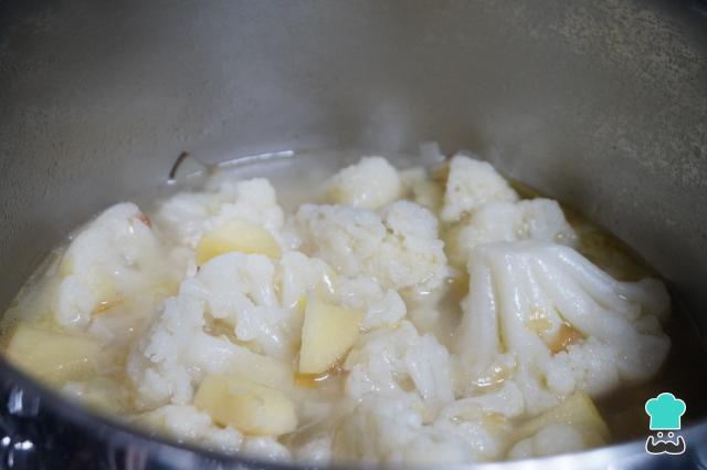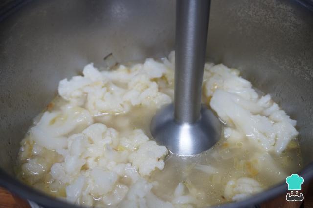 Una vez que esté cocinada la coliflor, saca la cazuela del fuego y tritúralo todo con una batidora eléctrica de mano hasta que quede como una crema suave. Si ves que queda muy espesa, se puede añadir un poco más de agua o caldo y dejarla a tu gusto.