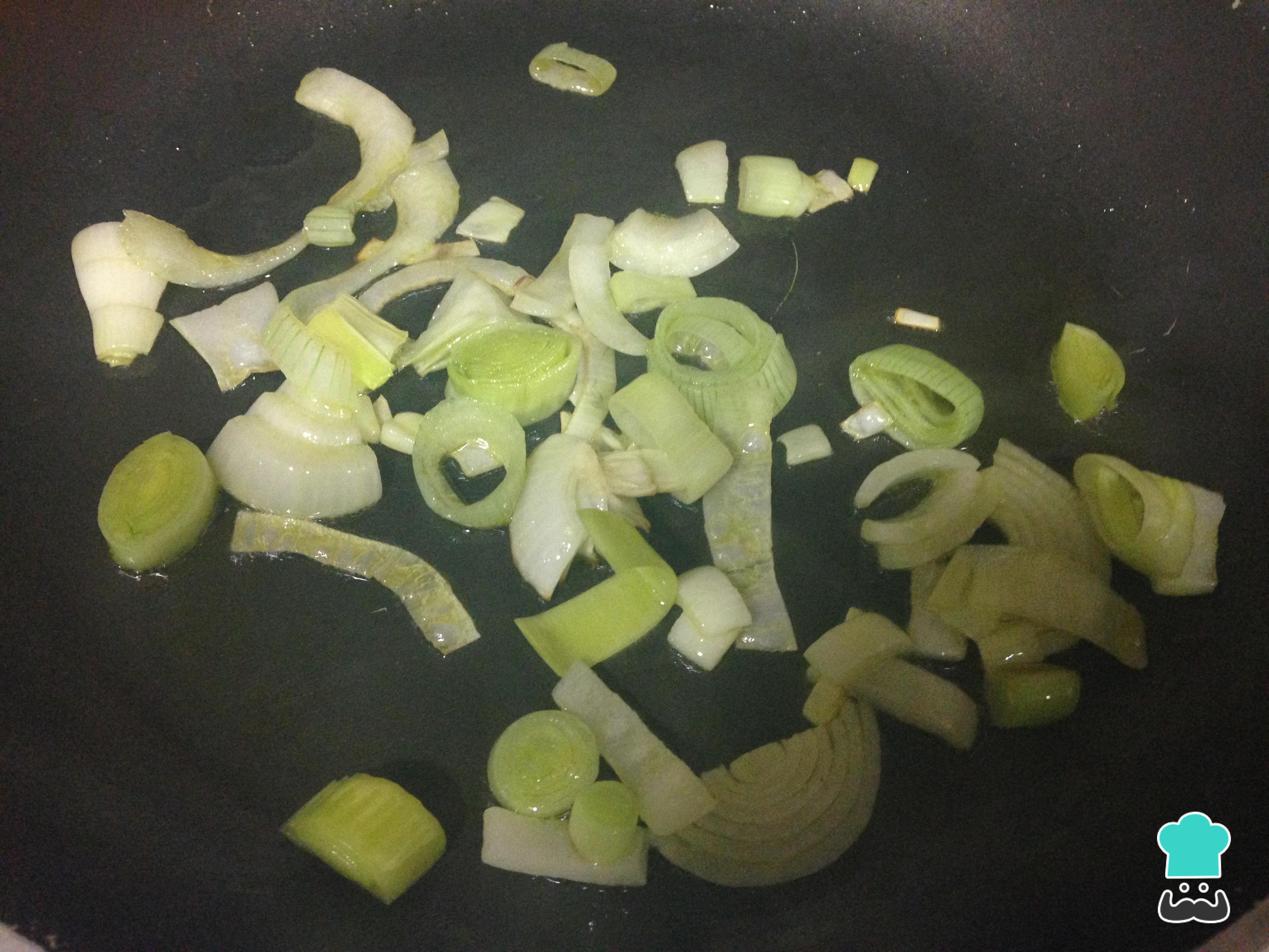 En una sartén hacemos un sofrito con la cebolleta y el aceite de oliva. Nosotros también hemos echado un poco de puerro. Dejamos dorar.