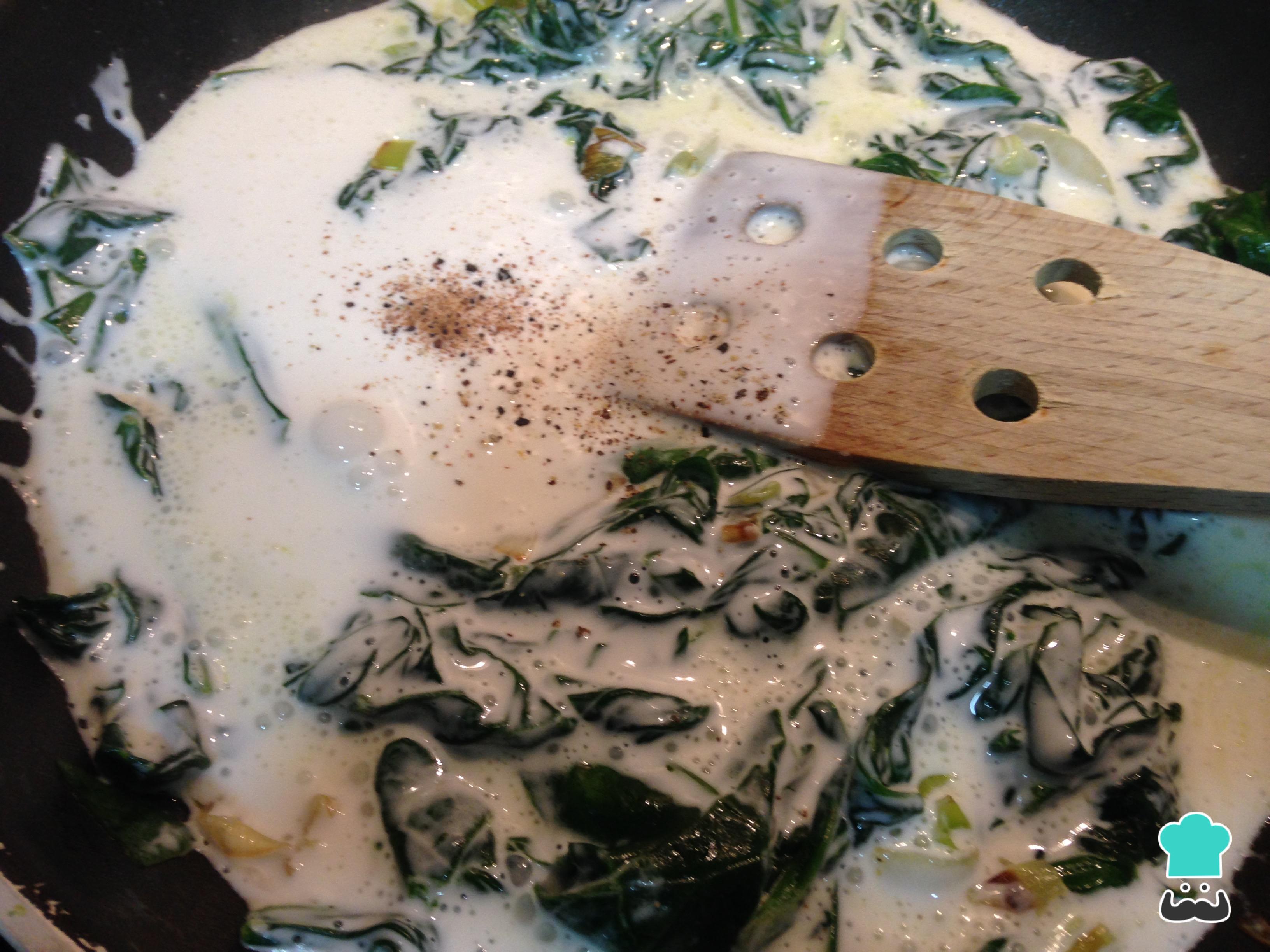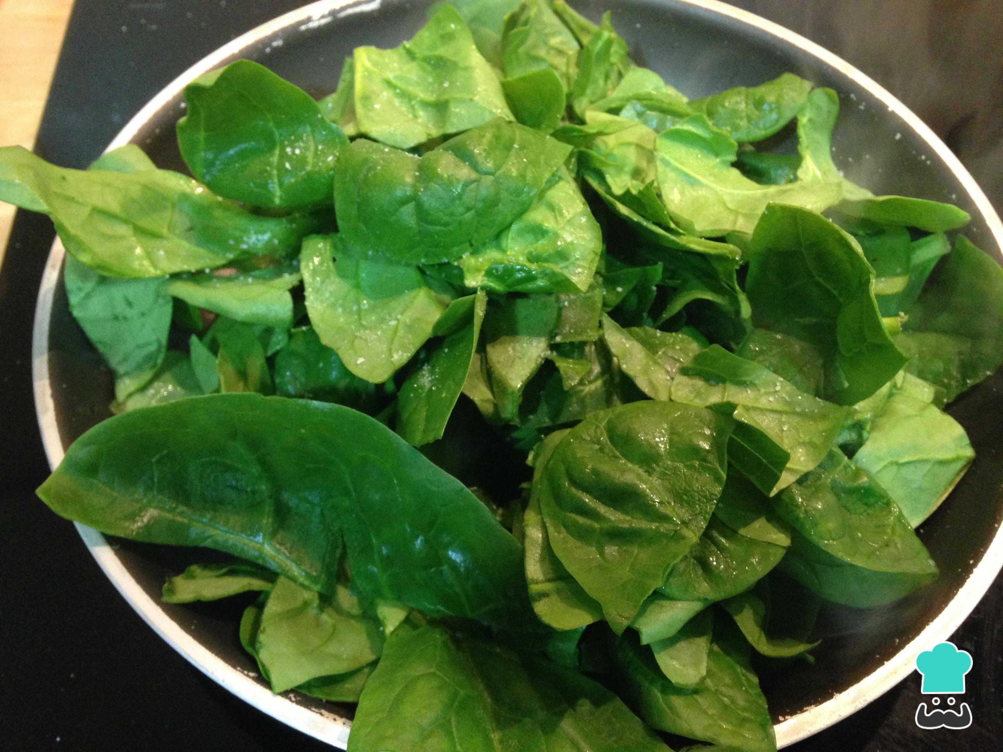 Incorporamos las espinacas frescas y dejamos que se rehoguen. Añadimos sal y pimienta.
