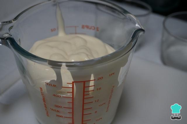 Pasamos la crema a una jarra. Además, preparamos los vasitos o recipientes que queramos emplear para servir el postre de limón y leche condensada.