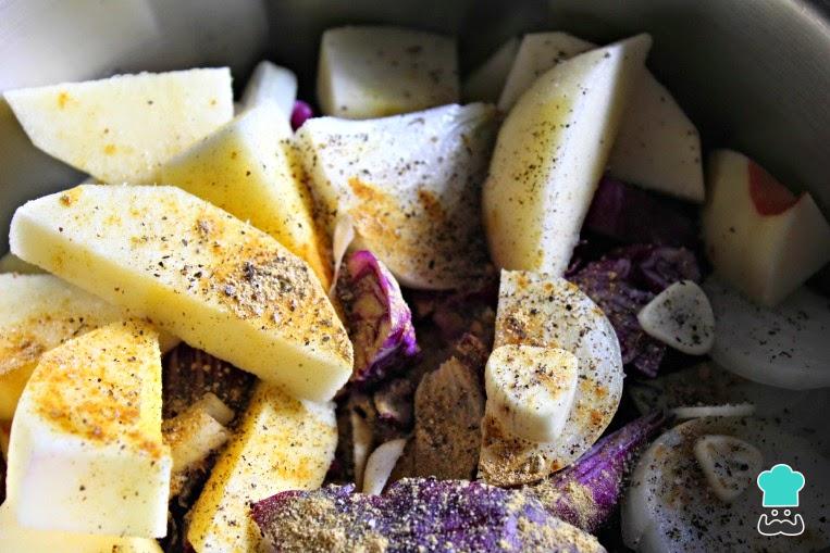 Para empezar a preparar nuestra sopa lombarda con ajos negros, lo primero que debes hacer es trocear las verduras, la cola, la manzana, la cebolla y los ajos normales.