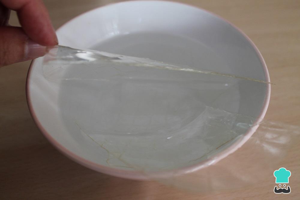 Para empezar a hacer nuestra crema diplomática casera, vamos a poner a hidratar en agua las hojas de gelatina. Si quieres, puedes usar en su lugar agar-agar.