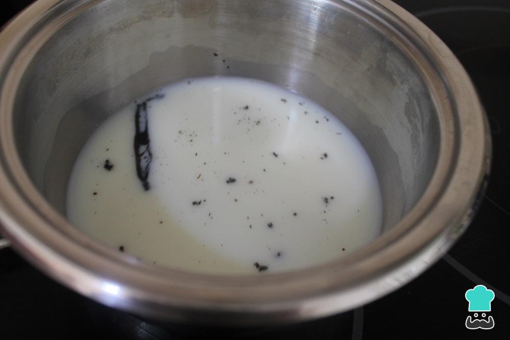 Partimos la vaina de vainilla por la mitad y raspamos bien una de las mitades para obtener todas las semillas que, después, añadiremos a una olla con la leche. Ponemos la preparación al fuego y, justo cuando hierva, la retiramos, tapamos y dejamos infusionar cinco minutos.