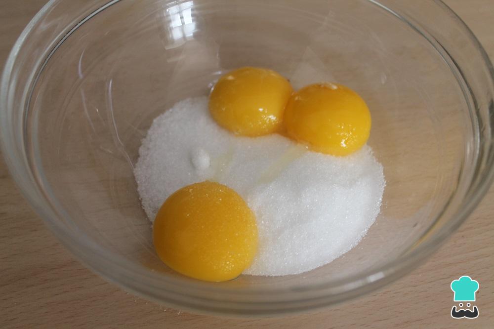En un bol ponemos las yemas de huevo junto con el azúcar y la maicena, y mezclamos bien para que no queden grumos de maicena.