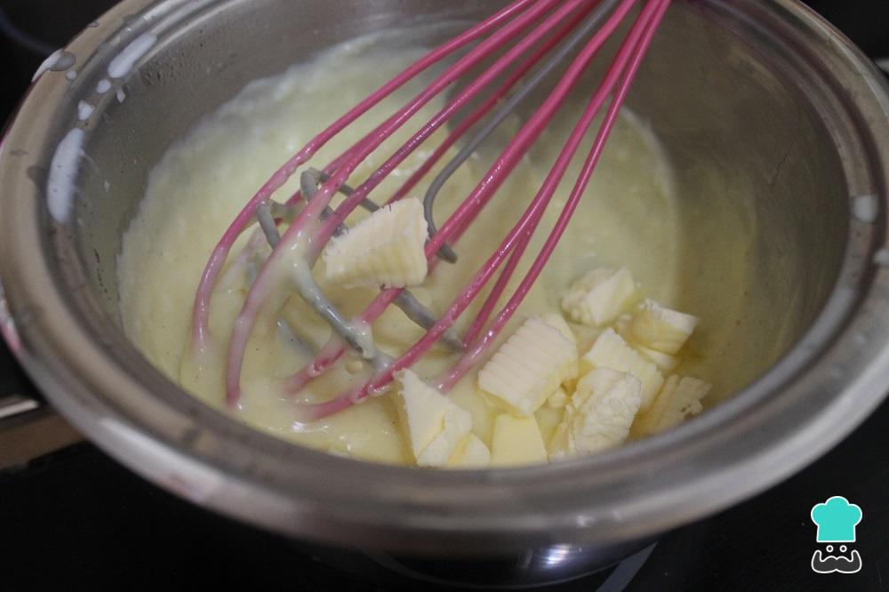 Retiramos la olla del fuego, incorporamos la mantequilla troceada y mezclamos bien hasta que se disuelva por completo.