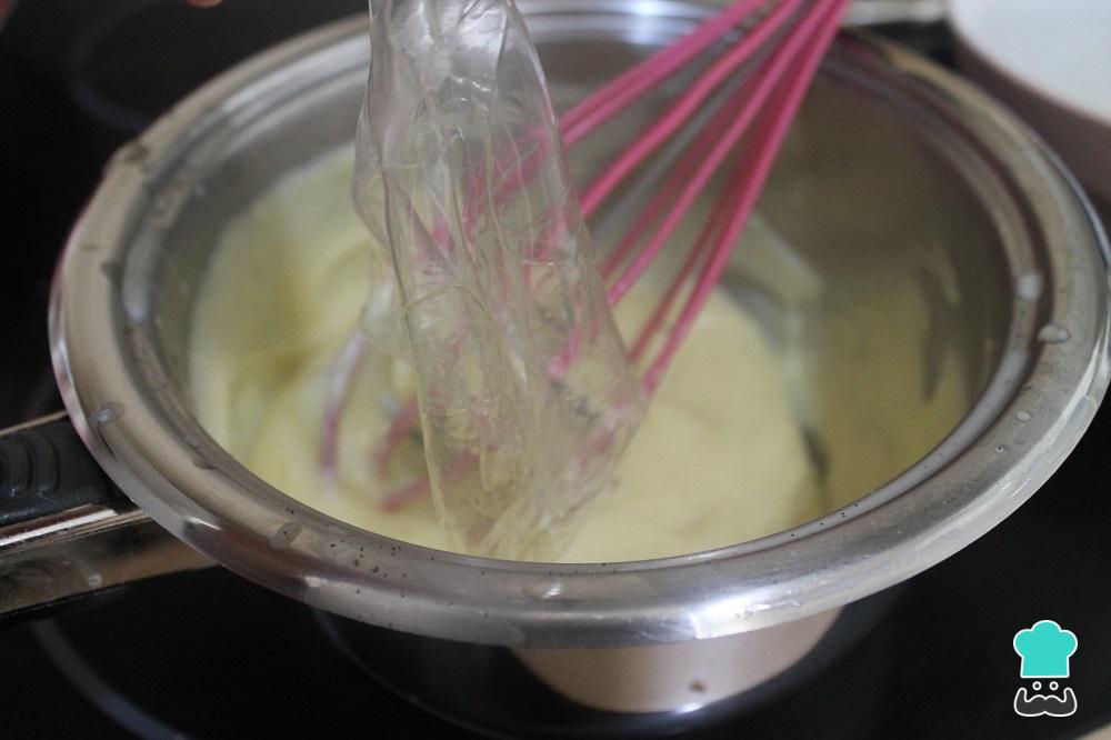 Escurrimos las hojas de gelatina que teníamos hidratándose y las añadimos una a una a la crema diplomática mientras removemos bien.