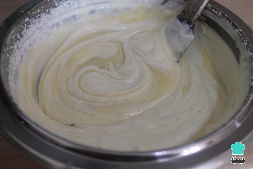Poco a poco, vamos añadiendo la crema a la nata montada y la mezclamos suavemente para que nos quede una crema diplomática suave y cremosa.