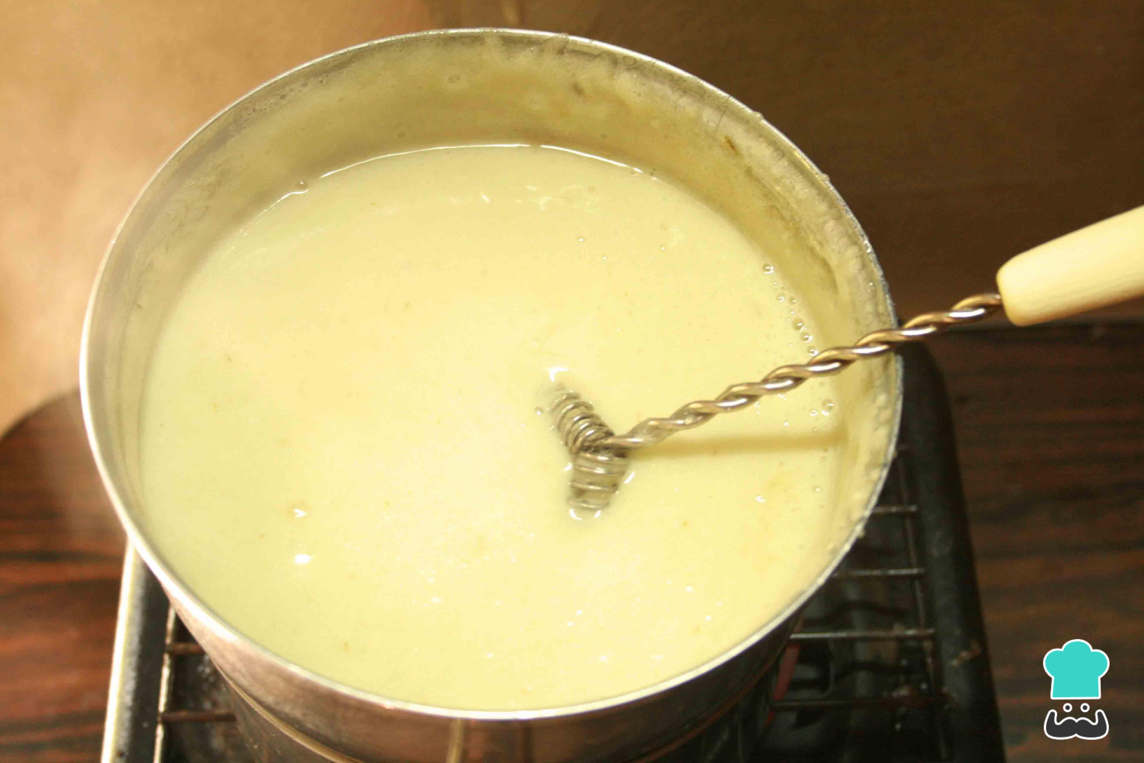 Prepara un baño María parar verter la preparación. Remueve con una varilla manual hasta lograr una consistencia espesa.