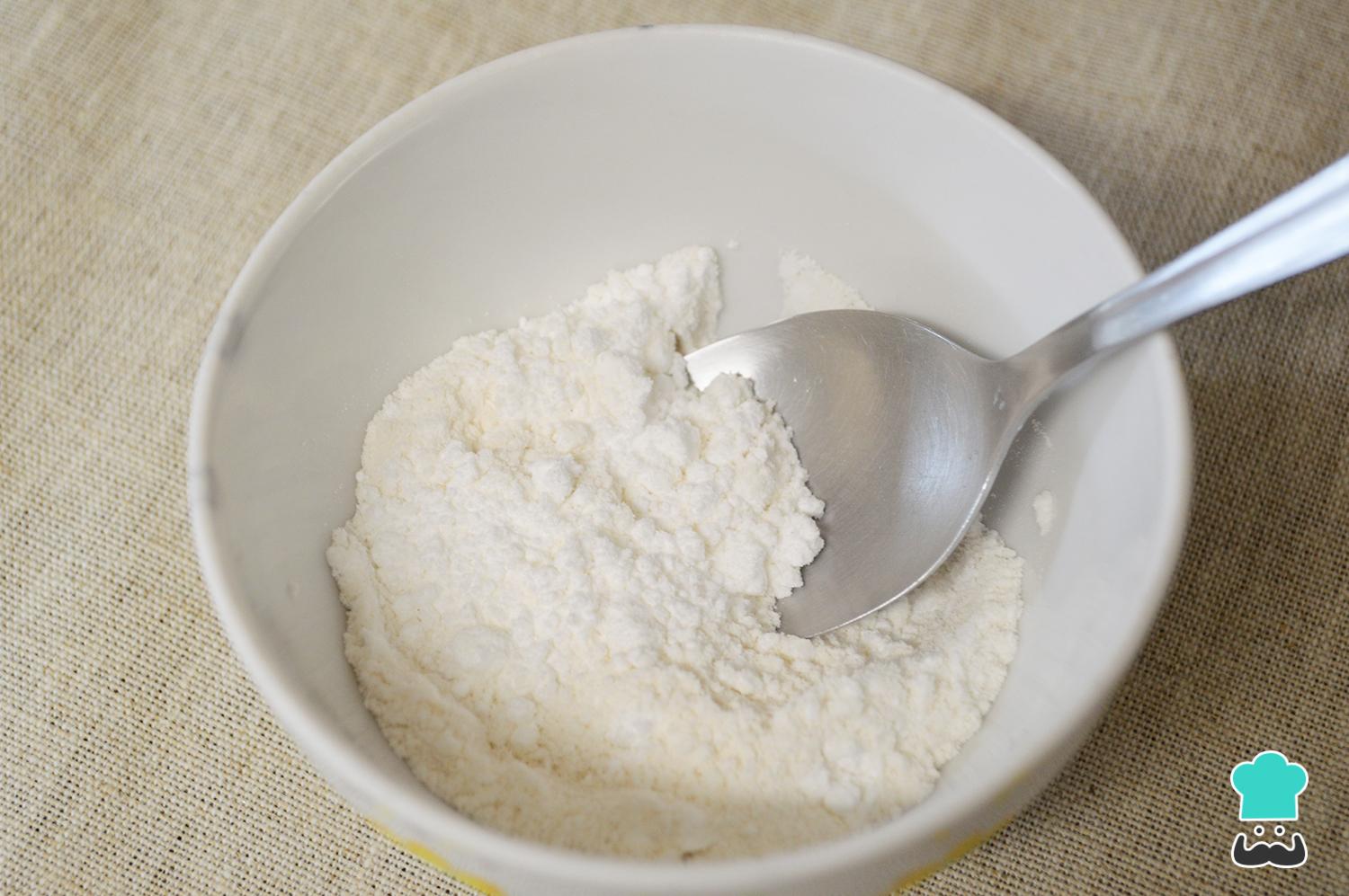Mezcla la maicena con el azúcar utilizando una cuchara, varillas manuales o tenedor. Puedes usar azúcar común o azúcar glas. Así mismo, si no tienes maicena puedes sustituirla por harina de arroz, la cantidad es la misma. En caso de querer aromatizar la crema con la rama de canela, recomendamos separar 50 ml de leche y calentarla durante 1 minuto al microondas con la canela.