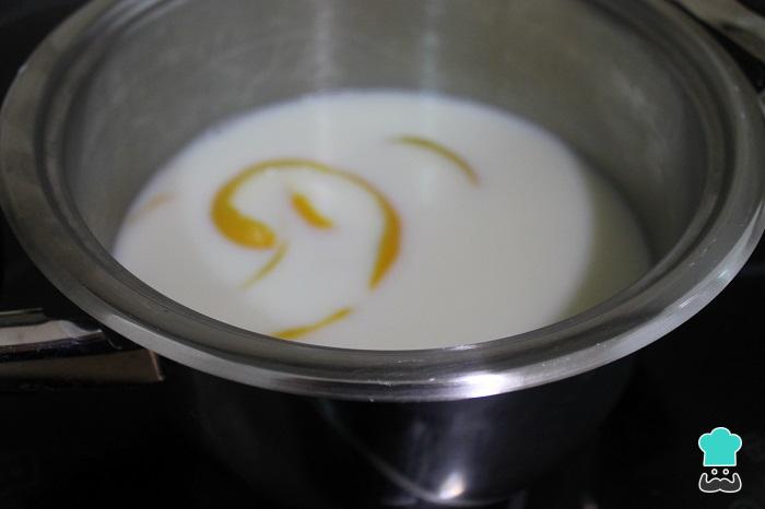 Para hacer una crema pastelera perfecta, vamos a poner un cazo amplio al fuego con medio litro de leche junto con tres cucharadas soperas de azúcar y la corteza de limón (sin coger mucha parte blanca, que es la que amarga).