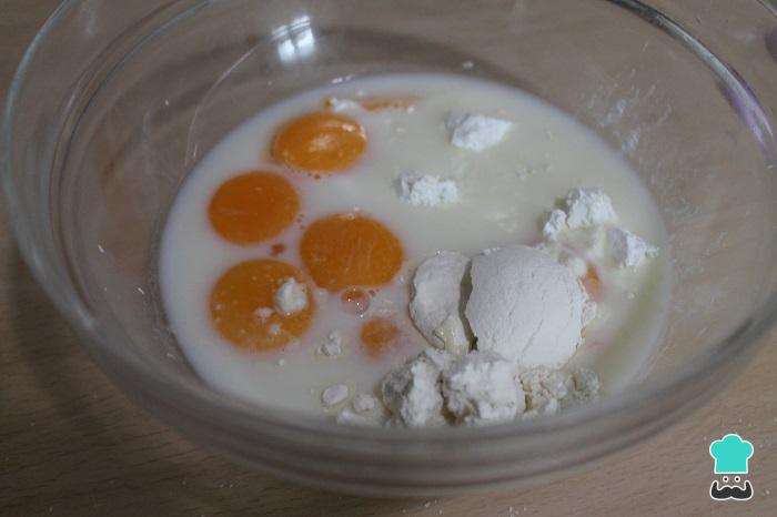 En un bol aparte, ponemos las yemas de huevo, el resto del azúcar, la maicena y la leche fría. Removemos con unas varillas para evitar los grumos.