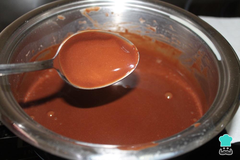 Remueve constantemente, a fuego suave. Deberías tenerlo al fuego hasta que consigas una temperatura de 85 ºC. Si no tienes termómetro, no te preocupes, esta crema pastelera de chocolate negro estará lista cuando espese ligeramente y nape la cuchara. Al sacarla del cazo, verás que se queda una capa fina en toda la cuchara.