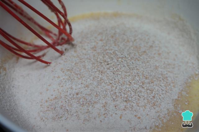 Por otro lado, tamiza la harina de espelta con la media cucharadita de sal. Incorpórala al bol de los líquidos y mezcla hasta que quede una masa suave sin grumos. La masa debe quedar líquida. Se puede hacer con una batidora y mezclar todo bien.