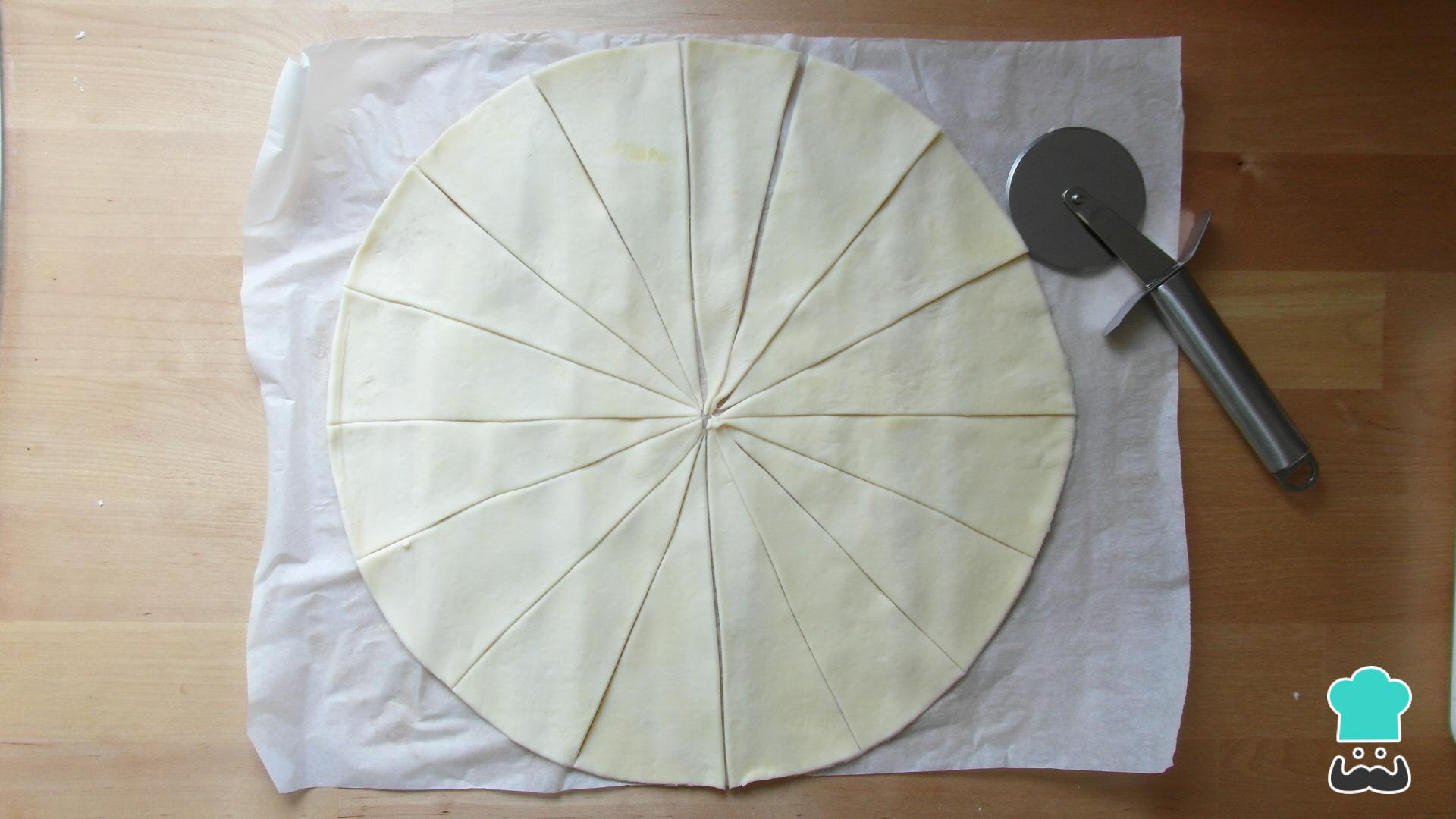 Abrimos el hojaldre y con un cuchillo o un cutter, lo cortamos en triángulos, como en la foto.