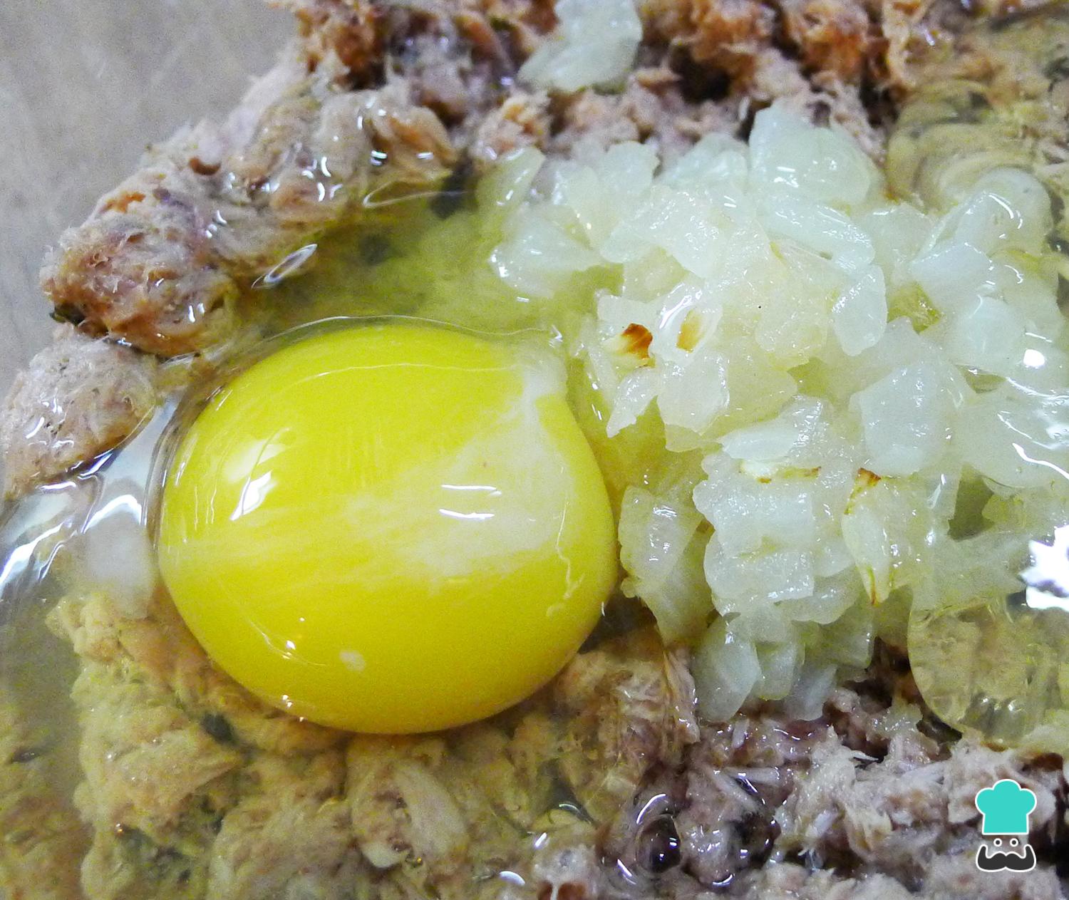 Una vez escurrido, coloca el atún en un recipiente grande y resérvalo un momento. Pica finamente la cebolla, coge una sartén, pon aceite a calentar y, cuando esté caliente, sofríela hasta que esté transparente. Retírala y mézclala con el atún y el perejil. Este último ingrediente no es imprescindible pero sí dará un toque de sabor a las tortitas de atún.