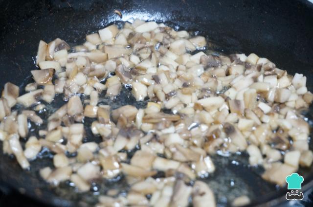 Empieza la receta de croquetas de champiñones limpiando los champiñones, quitándoles la tierra que puedan tener y córtalos en trozos pequeños. Calienta en una cazuela o sartén la mantequilla y un par de cucharadas de aceite de oliva. Cuando esté caliente, rehoga los champiñones, añade un poco de sal, deja que suelten el agua y cojan un poco de color.