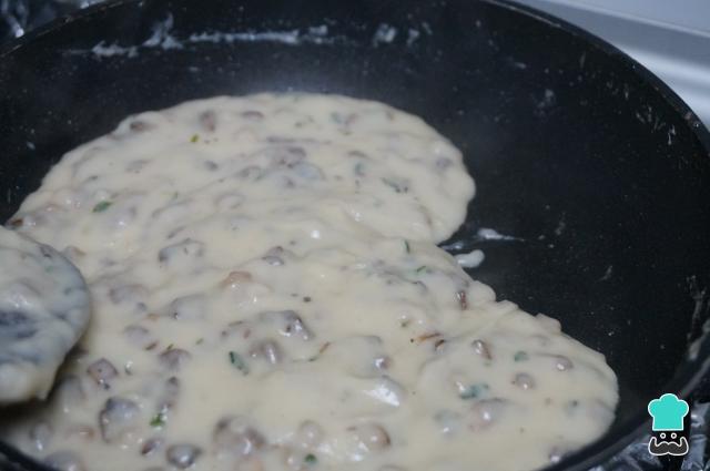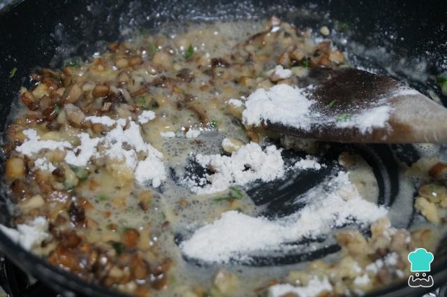 Añade la harina, mezcla y cocínala durante 2-3 minutos para que las croquetas de champiñones no tengan sabor a harina cruda.