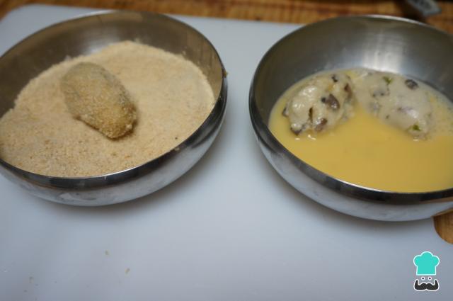 Forma las croquetas de champiñones dándoles la forma que más te guste, alargada o redondeada. En un bol pon el pan rallado y en otro los huevos batidos. Pasa las croquetas primero por el huevo y luego por el pan rallado.