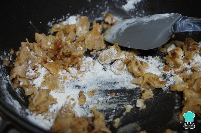 Incorpora la harina, mezcla y cocina sin dejar de remover durante un par de minutos para que se integre todo y la harina no quede cruda.